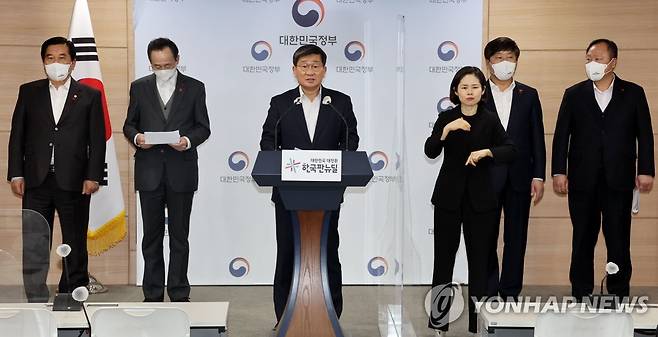 (서울=연합뉴스) 김승두 기자 = 전해철 행정안전부 장관이 13일 정부서울청사 브리핑실에서 제1회 중앙지방협력회를 마치고 중앙지방협력회의 운영을 통한 중앙-지방 협력형 국정운영 방안을 발표하고 있다. 이날 브리핑에는 전 장관을 비롯해 황명선 시장군수구청장협의회장, 송하진 시도지사협의회장, 김인호 시도의회의장협의회장, 조영훈 시군자치구의장협의회장이 참석했다. 2022.1.13