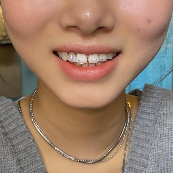라치카의 리안도 투스젬을 즐겨 한다. 알록달록 컬러 파츠를 활용하면 개성 있는 투스젬을 연출할 수 있다. 또한 치아의 가장자리를 따라 큐빅을 연결하면 어느 각도에서나 치아의 반짝임을 돋보이게 해 투스젬의 매력을 극대화할 수 있다!