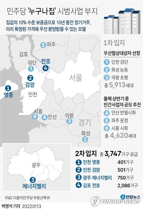 (서울=연합뉴스) 박영석 기자 = 더불어민주당은 13일 '누구나집' 시범사업의 2차 입지로 인천광역시 영종과 검암, 광주광역시 에너지밸리, 경기 김포시 전호 등 4곳을 발표했다.