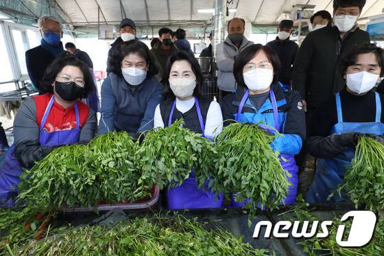 (청도=뉴스1) 공정식 기자 = 이재명 더불어민주당 대선 후보 부인 김혜경(가운데) 씨가 13일 오후 경북 청도군 청도 한재미나리 영농조합을 찾아 주민들과 미나리를 손질하고 있다. 2022.1.13/뉴스1