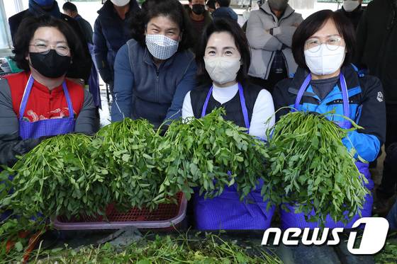 (청도=뉴스1) 공정식 기자 = 이재명 더불어민주당 대선 후보 부인 김혜경(오른쪽 두번째) 씨가 13일 오후 경북 청도군 청도 한재미나리 영농조합을 찾아 주민들과 미나리를 손질하고 있다. 2022.1.13/뉴스1