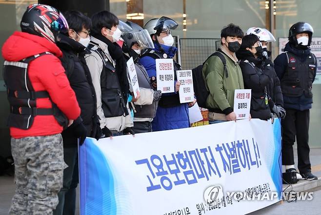 (서울=연합뉴스) 박동주 기자 = 13일 오후 서울지방고용노동청 앞에서 라이더유니온 관계자들이 기자회견을 열고 라이더에게 확대 적용되는 고용보험에 대한 입장을 밝히고 있다. 2022.1.13