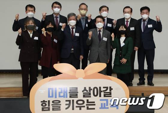 (서울=뉴스1) 김명섭 기자 = 조희연 서울시 교육감이 13일 서울 강서구 서진학교에서 열린 서울교육신년인사회에서 참석자들과 기념촬영을 하고 있다. 2022.1.13/뉴스1