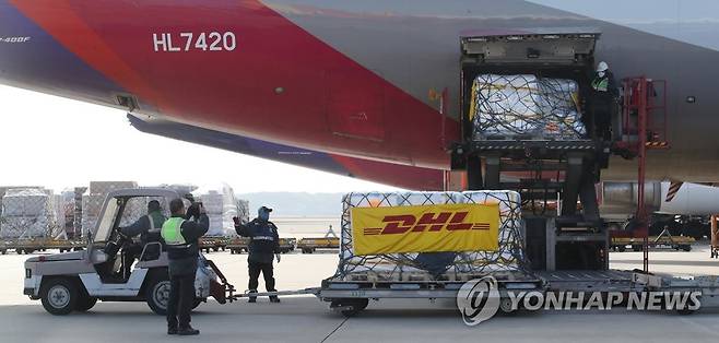 (영종도=연합뉴스) 13일 오후 영종도 인천국제공항 화물터미널에서 관계자들이 이날 처음 국내로 들어온 미국 제약사 화이자사(社)의 코로나19 경구용(먹는) 치료제 '팍스로비드' 2만1천명분을 옮기고 있다.