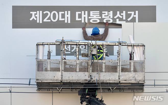 [대구=뉴시스] 이무열 기자 = 13일 오후 대구 서구 대구광역시선거관리위원회 건물 외벽에 제20대 대통령선거 투표참여를 독려하는 대형 홍보물이 설치되고 있다. 2022.01.13. lmy@newsis.com
