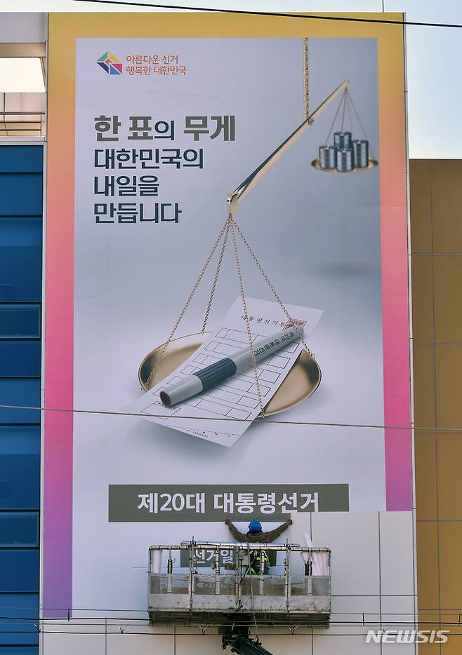 [대구=뉴시스] 이무열 기자 = 13일 오후 대구 서구 대구광역시선거관리위원회 건물 외벽에 제20대 대통령선거 투표참여를 독려하는 대형 홍보물이 설치되고 있다. 2022.01.13. lmy@newsis.com
