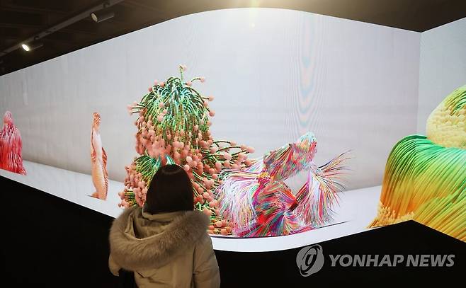 (서울=연합뉴스) 이재희 기자 = 13일 서울 종로구 경복궁역 서울메트로미술관에서 열린 '광화시대' 전시에 설치된 미디어월 '새로운 지평 II 인피니티'를 전시 관계자들이 살펴보고 있다. 유니버설 에브리싱의 작품으로 매순간 모양이 다른 크리처들(Creature)의 끊임없는 행렬이 이어진다. 2022.1.13