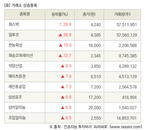 상승한 종목으로 퍼스텍(010820) 29.9%, 알루코(001780) 26.9%, 한농화성(011500) 15.0% 등이 있다.