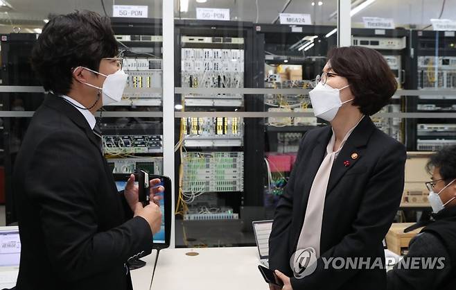 (서울=연합뉴스) 임혜숙 과학기술정보통신부 장관(오른쪽)이 13일 오후 정보통신기술(ICT) 수출 우수기업인 경기도 안양시 HFR을 방문해 김성중 HFR 센터장으로부터 'flexiHaul' 광전송장비에 관해 설명을 듣고 있다. 2022.1.13 [과학기술정보통신부 제공. 재판매 및 DB 금지]