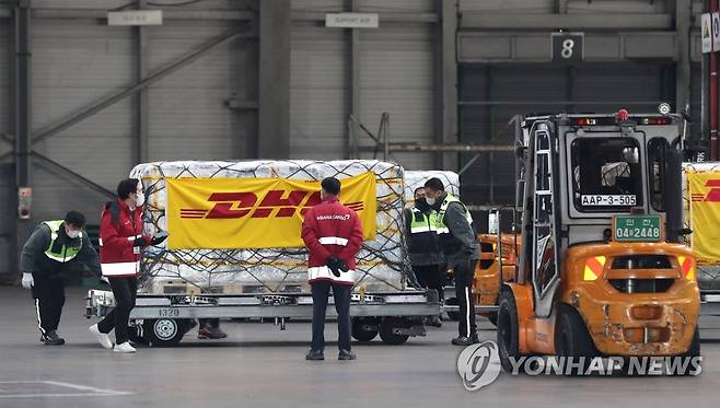 (영종도=연합뉴스) 13일 오후 영종도 인천국제공항 화물터미널에서 관계자들이 이날 처음 국내로 들어온 미국 제약사 화이자사(社)의 코로나19 경구용(먹는) 치료제 '팍스로비드' 2만1천명분을 수송 차량으로 옮기고 있다.