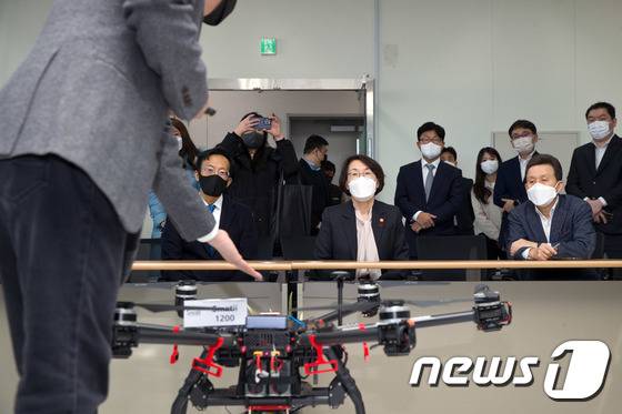 (서울=뉴스1) = 임혜숙 과학기술정보통신부 장관이 13일 오후 경기도 안양시 5세대(5G) 수출 기업 HFR을 방문, 이음5G 장비시연 설명을 듣고 있다. (과학기술정보통신부 제공) 2022.1.13/뉴스1