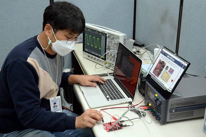 ETRI 연구진이 RVX 플랫폼을 활용해 개발한 초저전력 RISC-V 반도체의 성능을 측정하고 있다.