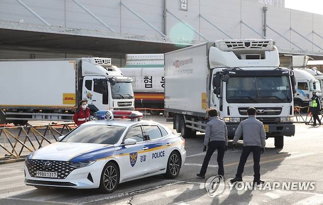 (영종도=연합뉴스) 13일 오후 영종도 인천국제공항 화물터미널에서 이날 처음 국내로 들어온 미국 제약사 화이자사(社)의 코로나19 경구용(먹는) 치료제 '팍스로비드' 2만1천명분이 수송 차량을 통해 각 지역으로 이송되고 있다.
