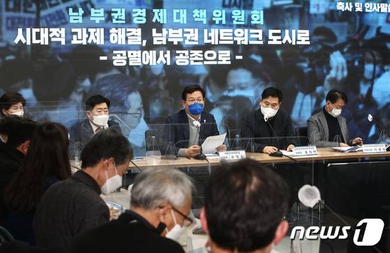 (서울=뉴스1) 오대일 기자 = 송영길 더불어민주당 대표가 13일 서울 여의도 중앙당사에서 열린 남부권경제대책위원회 출범식에 참석해 축사하고 있다. 2022.1.13/뉴스1