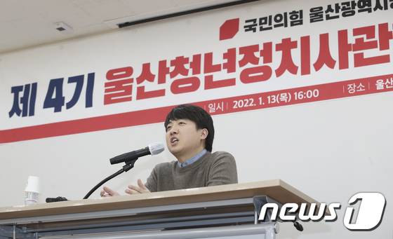 (울산=뉴스1) 윤일지 기자 = 이준석 국민의힘 대표가 13일 오후 울산 남구 국민의힘 울산시당에서 제4기 울산 청년 정치사관학교 특강을 하고 있다. 2022.1.13/뉴스1
