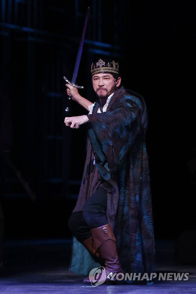 (서울=연합뉴스) 진연수 기자 = 배우 황정민이 13일 오후 서울 서초구 예술의 전당 CJ토월극장에서 열린 연극 '리차드 3세' 프레스콜에서 주요 장면을 시연하고 있다. 2022.1.13