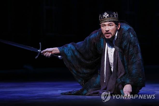 (서울=연합뉴스) 진연수 기자 = 배우 황정민이 13일 오후 서울 서초구 예술의 전당 CJ토월극장에서 열린 연극 '리차드 3세' 프레스콜에서 주요 장면을 시연하고 있다. 2022.1.13