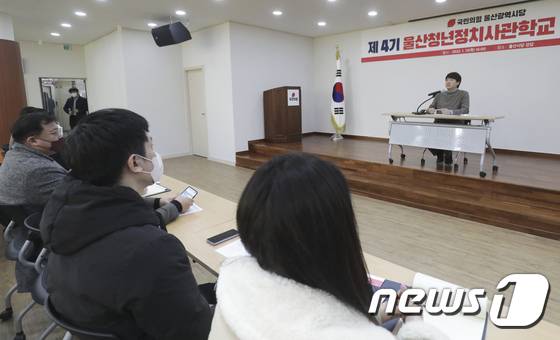 (울산=뉴스1) 윤일지 기자 = 이준석 국민의힘 대표가 13일 오후 울산 남구 국민의힘 울산시당에서 제4기 울산 청년 정치사관학교 특강을 하고 있다. 2022.1.13/뉴스1