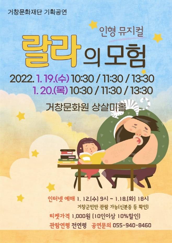 (재)거창문화재단(이사장 구인모)은 2022년 임진년 첫 공연으로 아이들을 위한 인형 뮤지컬 '랄라의 모험'을 선보인다고 밝혔다. 이번 공연은 지난 12월 예정되어 있었으나 관내 코로나 확진자가 다수 발생해 연기되었던 공연이다.