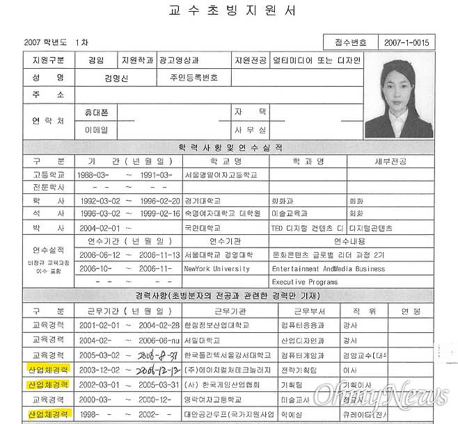 | ▲ 2006년 12월 김건희씨가 수원여대에 낸 이력서. |