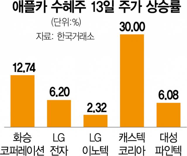 13일 코스닥시장에서 캐스텍코리아(071850)는 상한가인 30%까지 치솟아 4,355원으로 거래를 마쳤다. 캐스텍코리아는 지난 1988년 LG전자(066570)에서 분사했으며 LG전자에 전기차 모터 부품을 납품하고 있다. 애플카 실무진이 지난달 방한해 전장 부품 기업 몇 곳과 미팅을 했다는 소식에 케스텍코리아가 거론되며 자금이 몰린 것이다. 대성파인텍(104040)도 장중 15%까지 주가가 치솟았다가 상승 폭을 줄이며 전 거래일 대비 6.08% 오른 2,790원에 마감됐다. 대성파인텍은 LG전자와 전장 부품 조인트벤처(JV)를 설립한 캐나다 부품 업체 마그나에 부품 및 금형을 공급한 적이 있다는 이유로 ‘애플카 공급망’에 포함될 수 있다는 관측이 나왔다. 이 밖에 자동차 부품사인 화승코퍼레이션(013520)도 장 초반 20% 이상 급등했는데 역시 ‘애플카 공급망’에 포함될 가능성이 주가를 끌어올렸다는 분석이다.