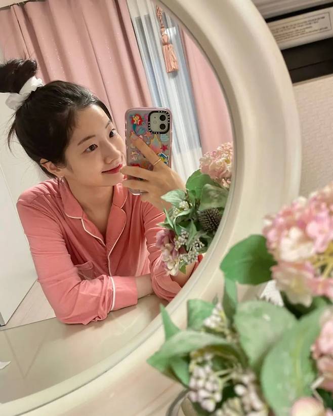 자연스럽게 묶은 헤어스타일과 핑크색 잠옷은 다현의 러블리한 매력을 더욱 돋보이게 했다.