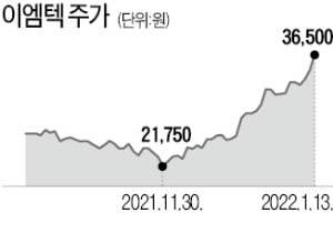 13일 이엠텍은 전 거래일 대비 6.1% 오른 3만6500원에 장을 마쳤다. 전날에 이어 사상 최고가를 또다시 경신했다. 이엠텍은 한 달 반 만에 주가가 60% 올랐다.