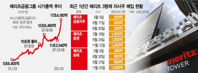 메리츠금융그룹 3사(메리츠금융지주(138040)·메리츠증권(008560)·메리츠화재(000060))가 연일 52주 신고가를 경신하며 독주를 펼치고 있다. 최근 1년간 지속되고 있는 자사주 매입 등 주주가치 강화 전략이 통하고 있다는 평가가 나온다. 실적 발표를 앞둔 계열사들이 사상 최대 연간 실적을 낼 것이라는 전망이 나오는 데다 올해 본격화된 금리 인상 추세에 따른 수혜 기대감까지 더해지며 주가에 상승 탄력이 붙었다는 분석이다.