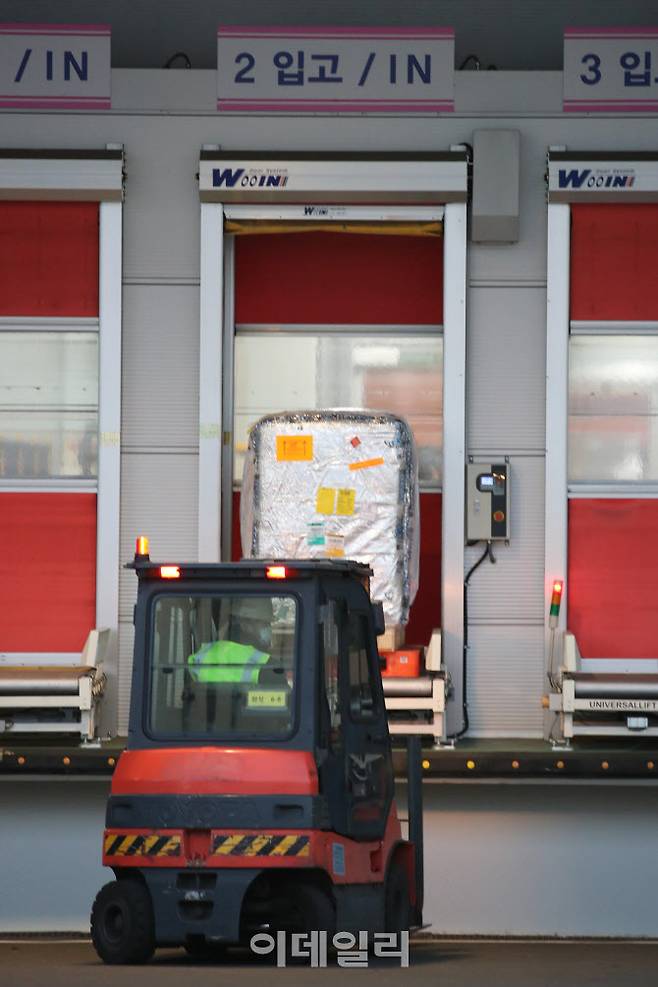 [오창=이데일리 이영훈 기자] 화이자 팍스로비드가 국내 입고된 13일 오후 충북 청주시 유한양행 오창 물류창고에서 지계차을 통해 약품이 적재된 박스를 옮기고 있다.