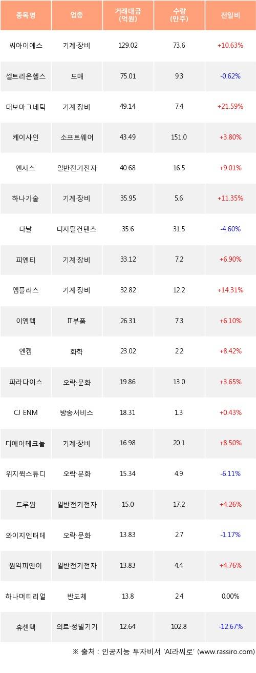 씨아이에스, 대보마그네틱, 케이사인 등은 전일 대비 주가가 상승했고, 셀트리온헬스케어, 다날, 위지윅스튜디오 등은 주가가 하락했다.