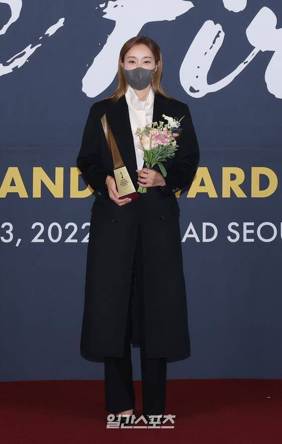 한유미가 13일 오후 온라인 생중계로 진행된 '2022 대한민국 퍼스트브랜드 대상 시상식'에 스포테이너 부문 대상 수상 후 포즈를 취하고 있다. <사진=한국소비자포럼>