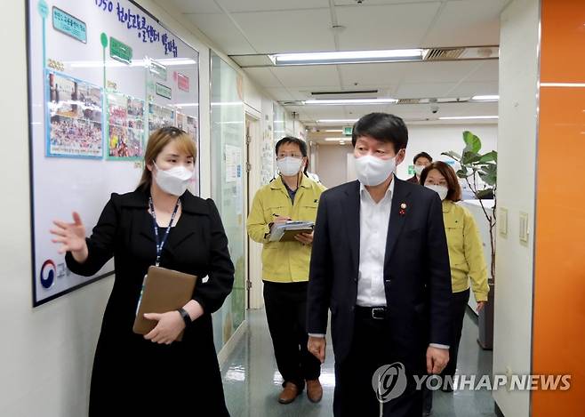 (서울=연합뉴스) 안경덕 고용노동부 장관이 13일 오후 충남 천안시 고용노동부 천안 고객상담센터를 방문, 방역관리 현황을 점검하고 있다. 2022.1.13