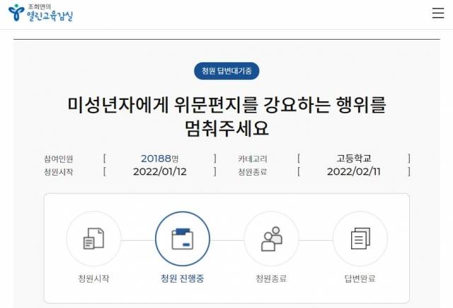 서울시교육청 시민청원 게시판에는 ‘미성년자에게 위문편지를 강요하는 행위를 멈춰주세요’‘라는 청원 글이 지난 12일 올라왔다. 있으며 13일 오후 현재 이 글에 동의를 한 사람은 2만 명을 넘었다.