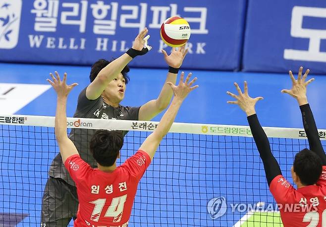 (수원=연합뉴스) 홍기원 기자 = 13일 경기도 수원실내체육관에서 열린 프로배구 V리그 남자부 한국전력 빅스톰과 대한항공 점보스의 경기. 대한항공 임동혁이 공격을 하고 있다. 2022.1.13