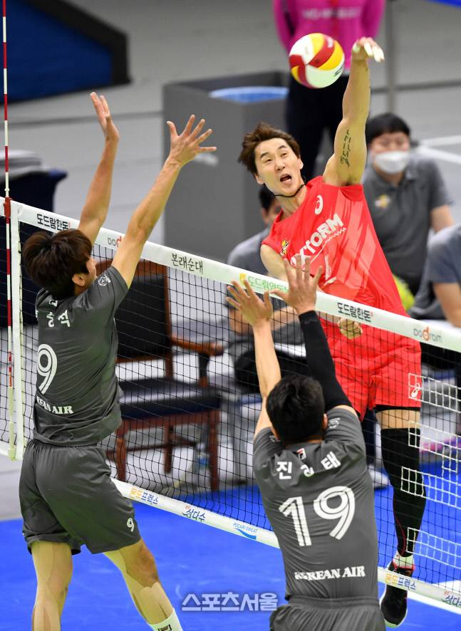 한전 박철우가 13일 수원체육관에서 열린 2021-22프로배구 남자부 한국전력과 대한항공의 경기에서 대한항공 이중블로킹에 강타를 터트리고 있다.2022.01.13.