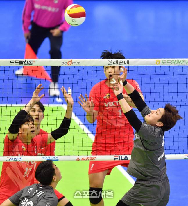 한전 서재덕이 13일 수원체육관에서 열린 2021-22프로배구 남자부 한국전력과 대한항공의 경기에서 대한항공 유광우와 밀어넣기 다툼을 벌이고 있다.2022.01.13.