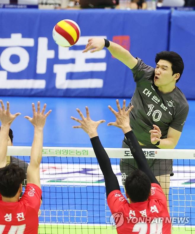 (수원=연합뉴스) 홍기원 기자 = 13일 경기도 수원실내체육관에서 열린 프로배구 V리그 남자부 한국전력 빅스톰과 대한항공 점보스의 경기. 대한항공 정지석이 공격을 하고 있다. 2022.1.13