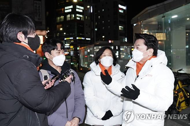 (서울=연합뉴스) 국민의당 안철수 대선후보가 부인 김미경 교수와 함께 13일 서울시 서대문구 대학가인 신촌에서 20·30세대 청년들과 만나 기념촬영을 하고 있다. 2022.1.13 [국민의당 선대위 제공. 재판매 및 DB 금지]