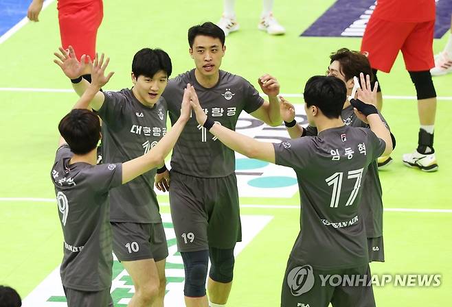 기뻐하는 대한항공 선수들