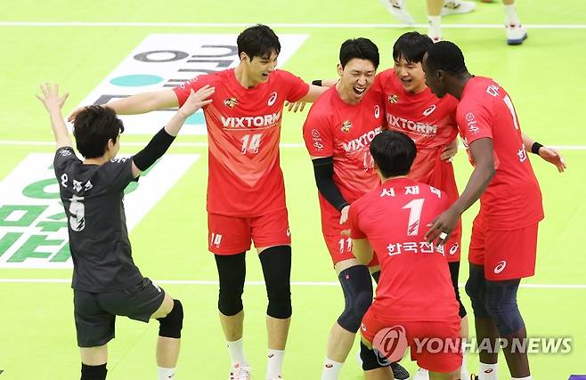(수원=연합뉴스) 홍기원 기자 = 13일 경기도 수원실내체육관에서 열린 프로배구 V리그 남자부 한국전력 빅스톰과 대한항공 점보스의 경기. 득점에 성공한 한국전력 선수들이 기뻐하고 있다. 2022.1.13