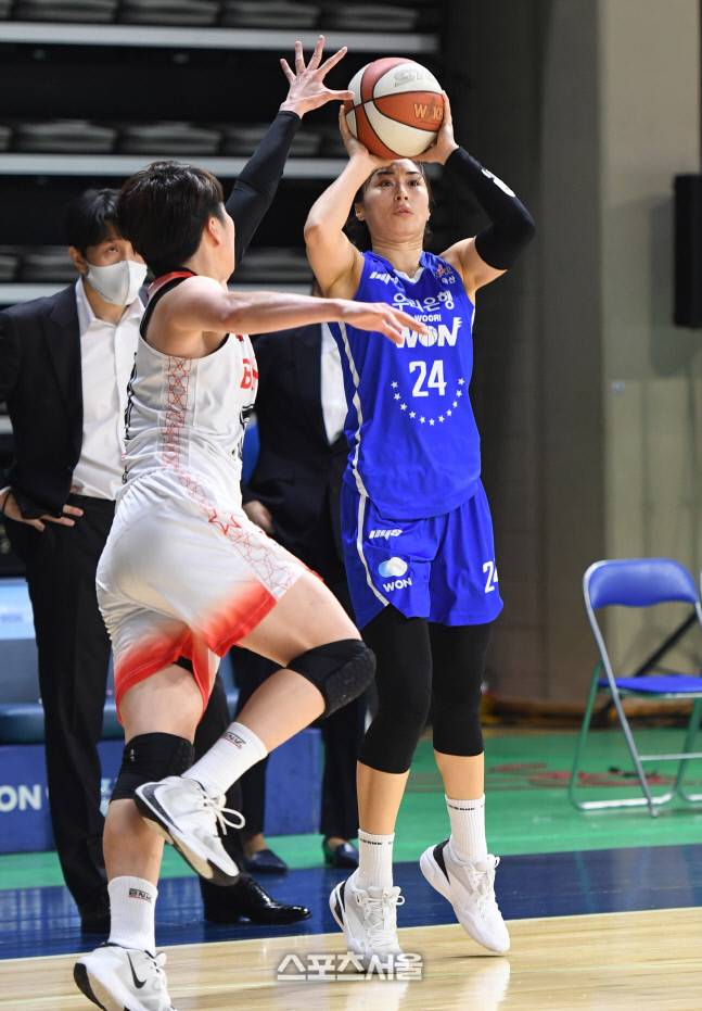 우리은행 김소니아(오른쪽)가 13일 충남 아산 이순신체육관에서 열린 2021-2022 여자프로농구 BNK썸과의 경기에서 위성우 감독이 지켜보는 가운데 3점슛을 던지고 있다. 2022. 1. 13.