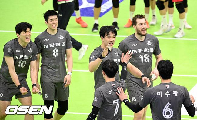 경기를 마치고 대한항공 선수들이 승리의 기쁨을 나누고 있다. 2022.01.13 / rumi@osen.co.kr