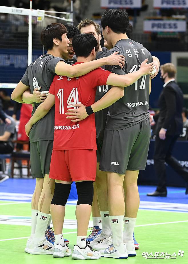 이날 경기에서 승리한 대한항공 선수들이 기뻐하고 있다.