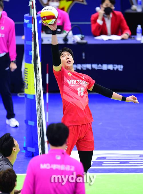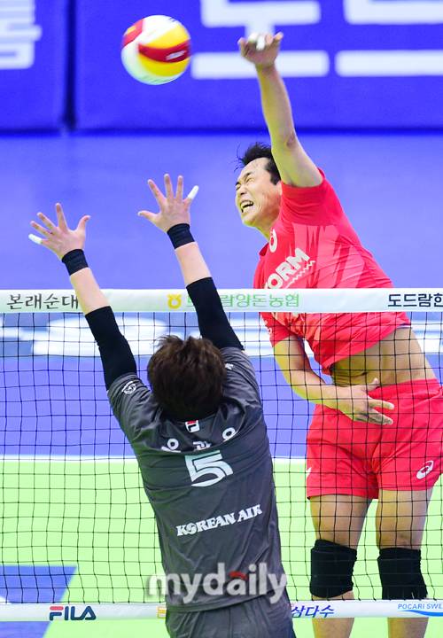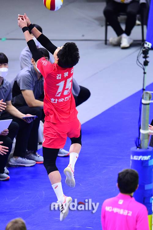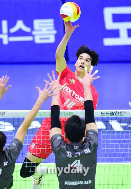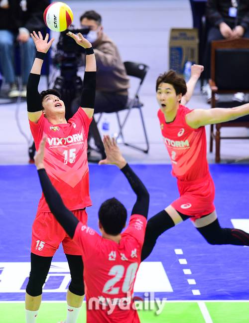 [마이데일리 = 수원 곽경훈 기자] 한국전력 김광국,서재덕,임성진이 13일 오후 경기도 수원실내체육관에서 진행된 '2012~2022 도드람 V리그' 한국전력-대한항공의 경기에서 공격과 수비를 하고 있다.- ⓒ마이데일리(www.mydaily.co.kr). 무단전재&재배포 금지 -
