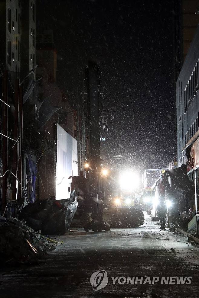 (광주=연합뉴스) 정회성 기자 = 실종자 6명이 발생한 광주 서구 주상복합아파트 붕괴사고 사흘째인 13일 오후 119구조대가 현장에서 중장비 등을 투입한 첫 야간 수색을 하고 있다. 2022.1.13