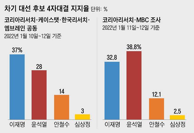 하지만 NBS 조사를 실시한 코리아리서치가 이날 MBC 의뢰로 실시해 발표한 차기 대선 후보 4자 대결 결과는 크게 달랐다(1월 11~12일 조사). 이 조사에선 윤석열 후보(38.8%)가 이재명 후보(32.8%)를 6%포인트 앞섰고 안철수 후보는 12.1%, 심상정 후보는 2.5% 등이었다. 코리아리서치·MBC가 1월 7~8일에 실시한 조사에선 이 후보(37.1%)가 윤 후보(30.5%)를 6.6%포인트 차이로 앞선 선두였지만, 나흘 만에 이 후보는 4.3%포인트 하락하고 윤 후보가 8.3%포인트 상승하면서 순위가 바뀌었다.