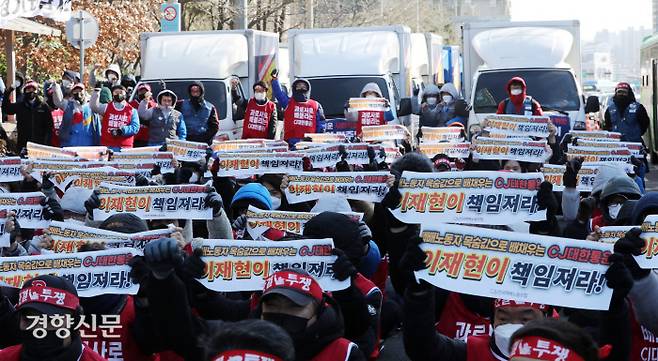 파업 중인 전국택배노조 CJ대한통운 노조원들이 13일 오후 서울 여의도에서 ‘택배노동자 과로사 방지를 위한 사회적 합의’ 이행 등을 촉구하며 집회를 갖고 있다. 노조원들은 이날 전국 각지에서 동시다발로 기자회견 및 차량시위를 벌였다.