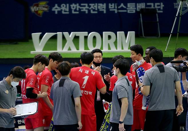 [서울=뉴시스] 추상철 기자 = 13일 수원 체육관에서 열린 도드람 2021-2022 V-리그 한국전력과 대한항공과의 경기. 한국전력 장병철 감독이 작전지시를 하고 있다. (사진= 한국전력 배구단 제공) 2022.01.13.
