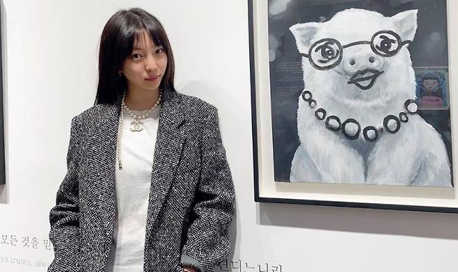 이 사진엔 전시회 작품 앞에서 포즈를 취한 이진이의 모습이 담겼다.