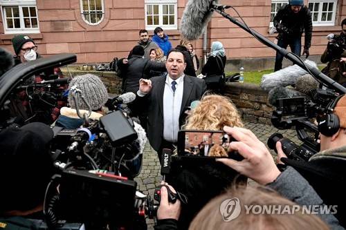 epa09682670 Syrian lawyer Mazen Darwish speaks to the media after the verdict against a former Syrian secret police officer, at the Higher Regional Court in Koblenz, Germany, 13 January 2022. In the world's first trial on Syrian state torture, Anwar Raslan has been sentenced to life imprisonment for crimes against humanity, 27 counts of murder and other offenses. This was announced by the Higher Regional Court (OLG) in Koblenz. EPA/SASCHA STEINBACH